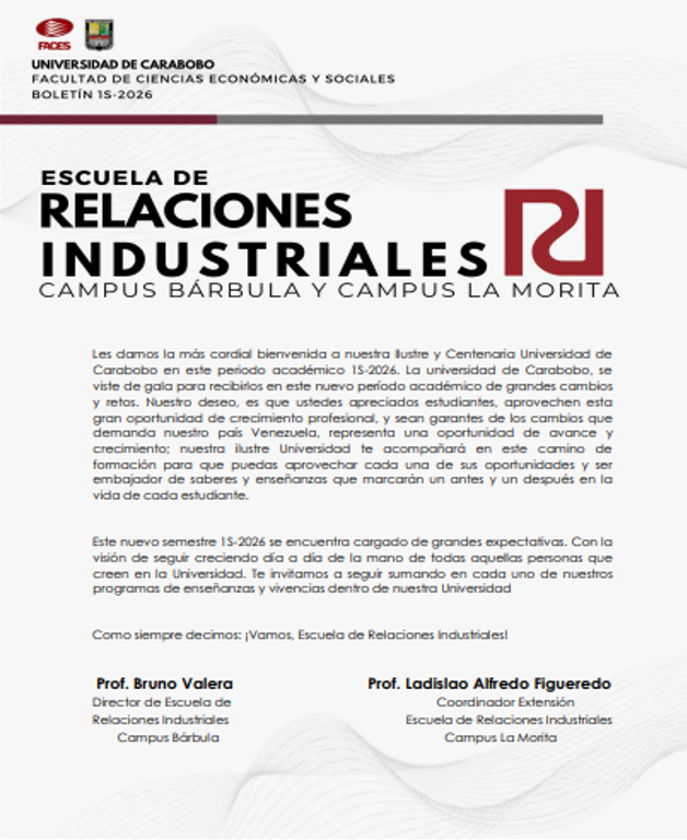 La Escuela de Relaciones Industriales de la Universidad de Carabobo, tiene como misión fundamental, formar y desarrollar profesionales en el área de Talento Humano, capaces de gerenciar exitosamente el capital humano de las organizaciones, propiciando el desarrollo de competencias que les permitan insertarse adecuadamente al mundo laboral globalizado, atendiendo a principios de excelencia, pertenencia, integridad, innovación constante y calidad, para lo cual cuenta con un cuerpo de docentes y de personal administrativo altamente calificado con amplia experiencia y espíritu proactivo que garantizan la formación integral de nuestros estudiantes.